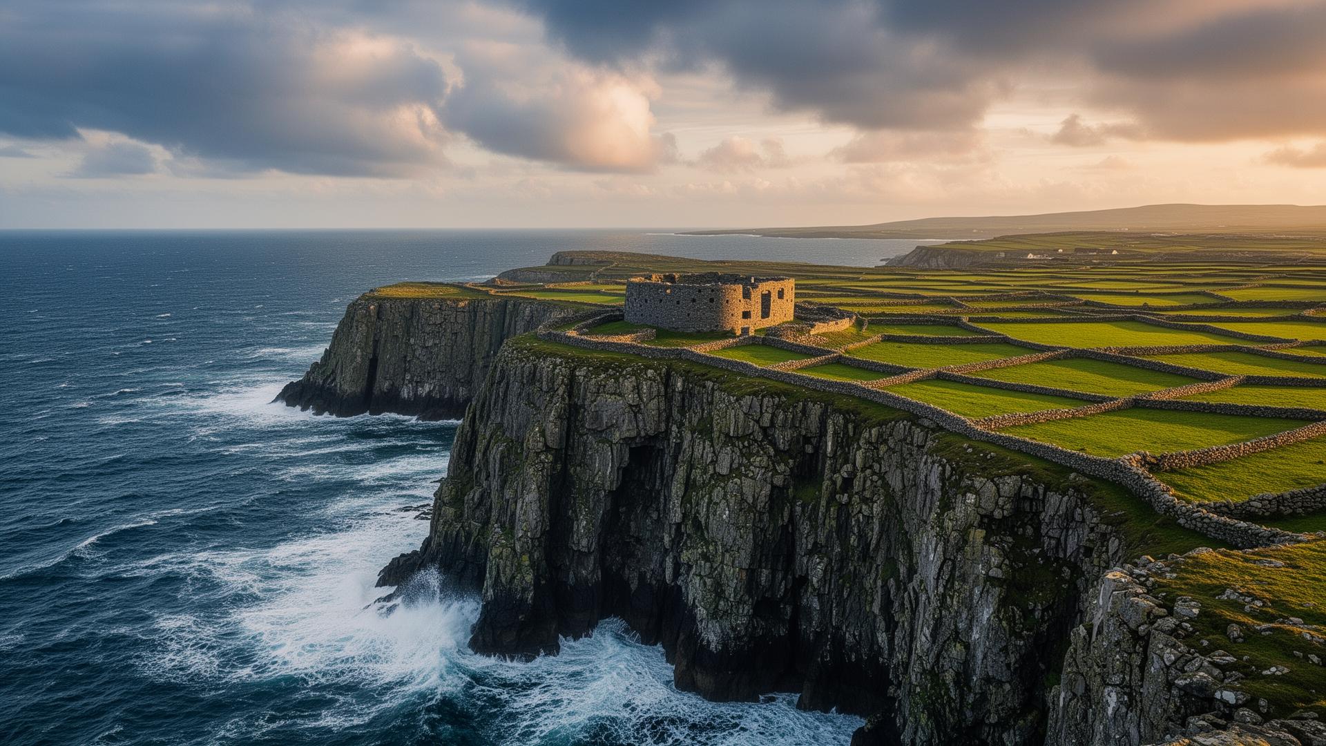 A 3,000-year-old semicircular stone fort perched on a 100m sea cliff on Inis Mór's south coast. Three concentric walls and a chevaux-de-frise of upright stones. No barriers at the cliff edge — lie down and crawl to look over. One of the great archaeological sites of Atlantic Europe.