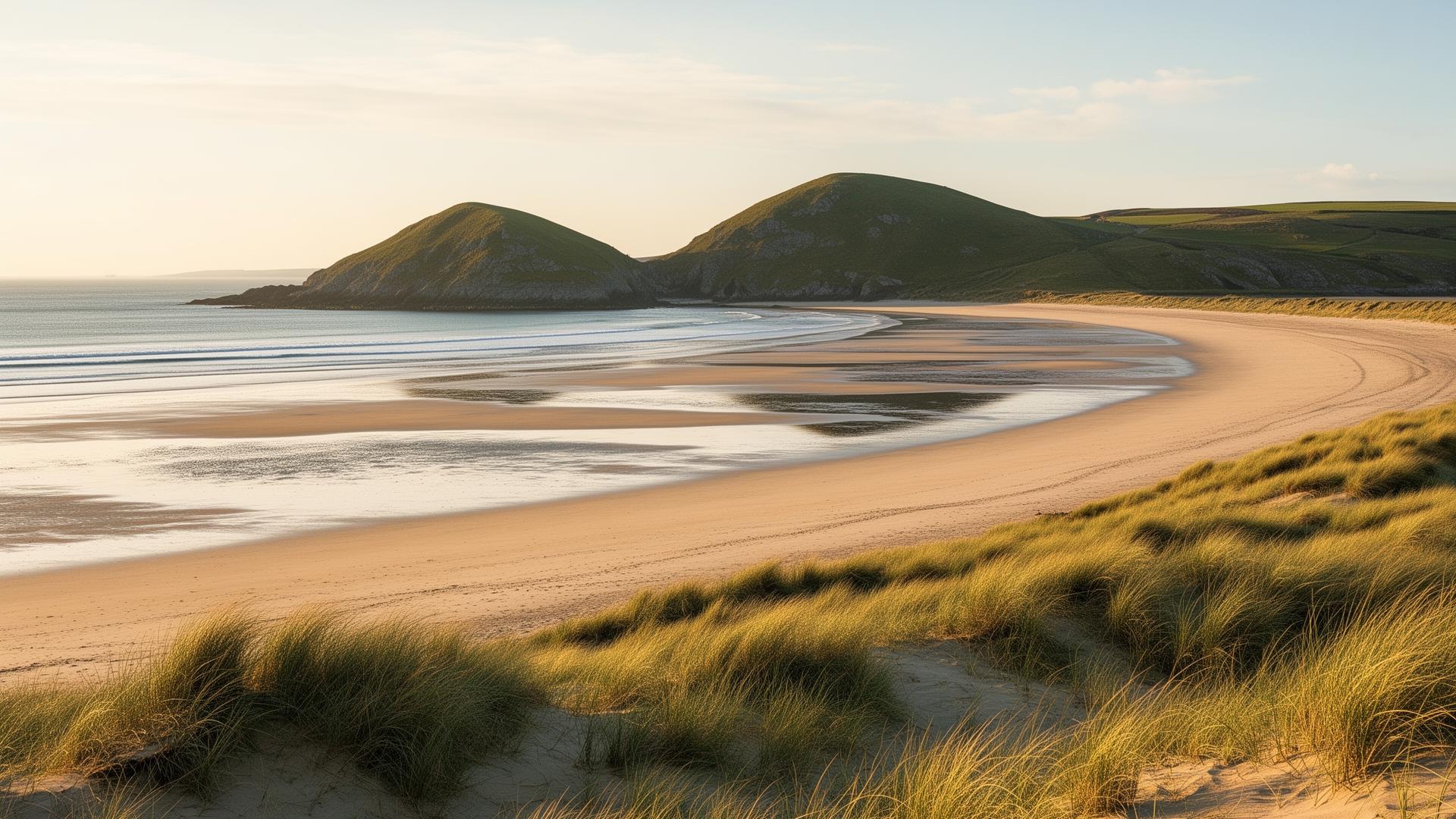 Two long sweeps of Blue Flag sand divided by a grass-topped headland called the Virgin Mary's Bank. Surfers, walkers, families. The water shelves gently — one of the safest swimming beaches in West Cork. Five minutes outside town across two causeways.