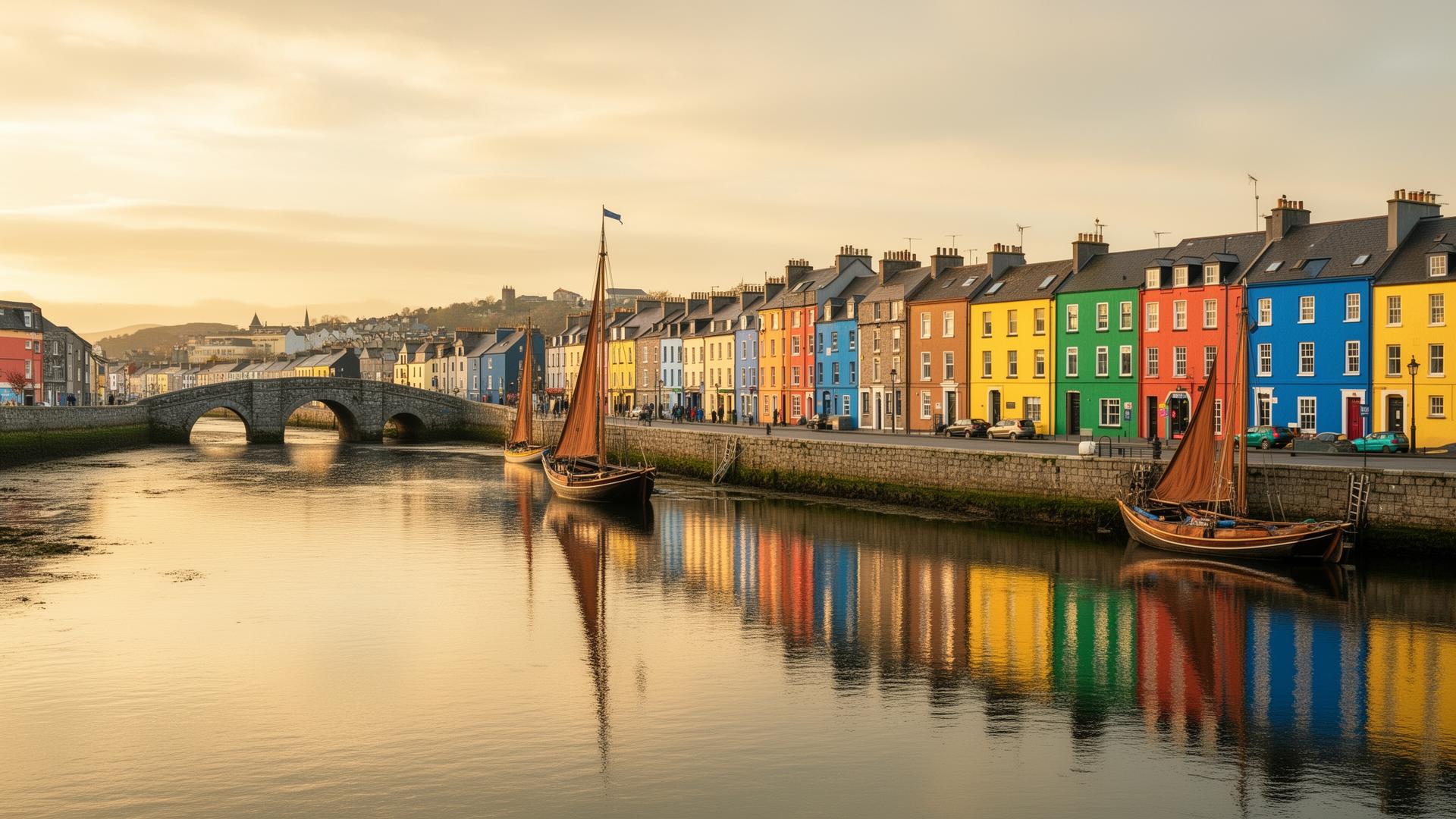 The pedestrianised spine of medieval Galway: Shop Street running into Quay Street and High Street. Buskers, painted shopfronts, two ancient pubs (Tigh Neachtain's, The King's Head), and the 14th-century Lynch's Castle hiding in plain sight as a bank. Walk it slowly.